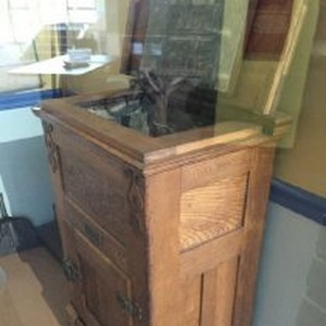 A wood ice box with metal fittings, metal plaque above door "Breuner", single door section with ice container, vines carved above plaque.