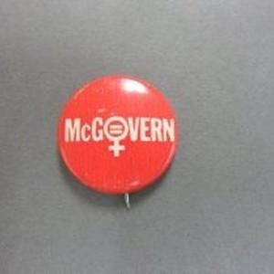 White text on red background. "McGovern" w/equal rights for women symbol. Stamped on edge: Votes Unlimited Ferndale, NY