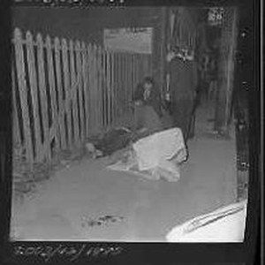 Auto accident - Men examining two bodies near fence.