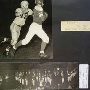 Photo--Black and white: Analy High School Football fall1951. Two photos of the Analy Tigers vs Napa, Friday night October 24th, 1952. Bottom photo of Analy marching band on the football field in formation with three drum majorettes at left.