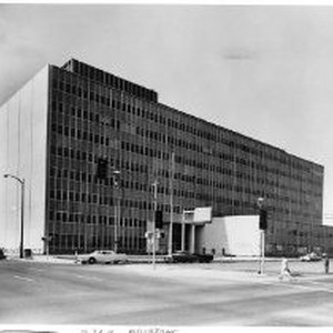 Left front view of the Federal Office building at 650 Capitol Mall. Foreground includes intersection, pedestrians and automobiles. Completed in 1961, this 355,155 sq. ft. office building, designed by Devine, Goodpastor, Franceschi and Dreyfuss, cost more than $7,000,000. This eight-story structure was the first office building to be completed in the Redevelopment Area.