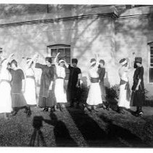 Ten girls posed in dance practice costumes. Photographer's shadow in foreground.