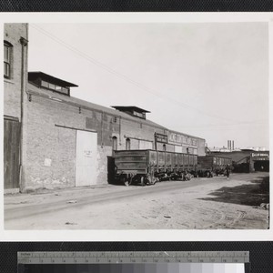 View of brick buildings on Jeanette Street near Old Chinatown in Los Angeles, with signs for The Braun Corp Ware House and Acme Contractors. Rail cars are parked at the side of building. Title provided by cataloger; title illegible.
