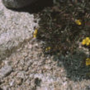 Close-up of small green plant with yellow flowers growing out of rocky summit area.