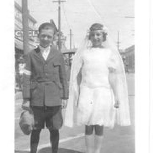 Photo--black and white: Geraldine Perry and Vergil Mello circa 1930s. Geraldine is wearing First Confirmation dress for Catholic Church. Virgil is wearing nickers & suit with white ribbon tied in a bow around his right arm for First Confirmation.