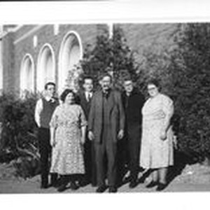 J. F. Triggs family--Delbert "Deb" Triggs, Belle (Mrs. J. F.), Arthur Triggs, J. F. Triggs, Dutch Triggs and Ruth Triggs Karutz--beside Analy High School, May 1941