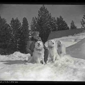 2/1/52 - Sierra snowstorm - Man and three dogs. 11 of 15
