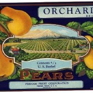 Crate label. Orchard Brand Pears. Perham Fruit Corporation, Yakima, Wash., U.S.A. Distributor. Contents 4/5 U.S. Bushel. View of pear orchard, truck hauling pears. Cluster of pears surrounding image of orchard. Dark background.