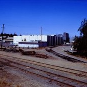 Slide--color: looking northwest toward Petaluma Avenue in background on left. The P&SR tracks in foreground with spur line behind building. 1970. Large building in center is currently (2012) Post Office annex.