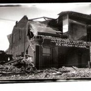 Black & white photo of 1906 Earthquake damage--Worth's Drug Store on Main Street.