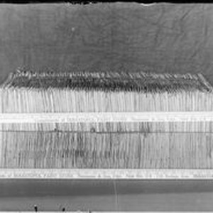 Negative glass-plate photo: Photo of filters ? and two yardsticks. Yardsticks advertise Naumann & Sons Sebastopol Paint Store. From a glass plate negative made by William Borba.