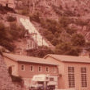 Building along hillside with pipeline running down in the background.