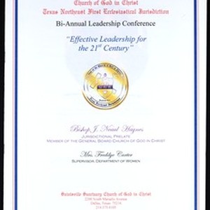 Program for the Texas Northeast First Ecclesiastical Jurisdiction Bi-Annual Leadership Conference, Saintsville Sanctuary Church of God in Christ, Dallas, Texas, 2010 January. [Description English/roman)]