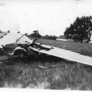 Photo--black and white: A. S. Huck, Sr. crash-landed his Jenny at Cnopius Field in Sebastopol. Mrs. Julia Huck was at the field at the time of the crash. Huck was not injured.