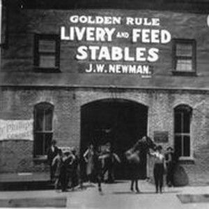 Photo -black and white: A group of men stand in entryway of brick building of Golden Rule Livery Stable that was located on South Main and Burnett Streets Sebastopol, in 1890. To the right of the entryway is a sign that states: "Dr. Summerfield--Veterinary Surgeon and Dentist Attends Here Sunday." On the left a sign for Dr. Phillips, Coroner. The Golden Rule was advertised as the "only brick stable in Sebastopol" and the proprietors were the Sullivan brothers.