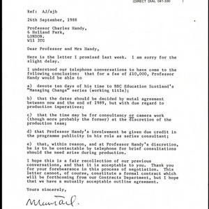Letter of correspondence to Charles and Elizabeth Handy from Allan Jack of the BBC, concerning previous negotiations and the amount of a fee for Charles Handy's contributions. Jack begins the letter stating that, for a negotiated fee of 10,000 pounds sterling, Handy has agreed to five statements concerning the recording of a series with BBC Education Scotland. Allan then expresses the hope that his list is acceptable to Handy, and how, although his letter cannot constitute a formal contract, he hopes that they have a mutually acceptable outline agreement.
