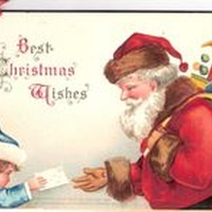 Postcard--color picture: Christmas greeting: Best Christmas wishes,” with young girl handing Santa a letter. Five handwritten game sheets attached.