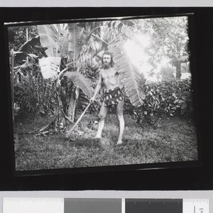 Ernest Darling stands under palm tree in checked loin cloth holding a pick axe. Title and date transcribed from enveloper. Copy print of original. Ernest Darling inspired Jack London's story "The Nature Man."