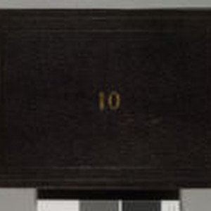 Bound in textured black material. The number "10" is embossed in gold in center of cover. The number "10" is also affixed to the top of spine with glue. Contains photographs taken by Jack London while on assignment to cover the Russo-Japanese War. Black material is cracked in places on cover. The photographs in this album appear to be for the most part commercially produced for tourist trade and sale to newspapers. Not taken by London.
