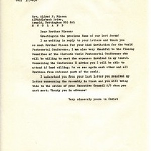 A letter by Ludvik Üllena to Alfred F. Missen about his plans to visit the eleventh wold Pentecostal conference. [Description English/roman)] Pismo Ludvika Üllena Alfredu F. Missenu o njegovim planovima da posjeti 11. svjetsku pentekostalnu konferenciju. [Description (original non-English/roman language/script)]