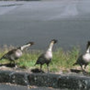 A group of three geese standing on a cement ledge at the Kilauea Overlook.
