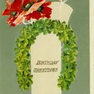 Postcard--colored picture: Horseshoe made of four-leaf clover with poppies and "Birthday Greetings" message. Handwritten message on back to Mary Guisler from Mrs Johnson. Dated August 14, 1911