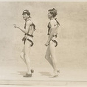 Shows two dancers on stage. Stamped on verso: "20th Annual Olympic Club Track & Field Meet at San Quentin prison, c. 1920." View 1 (2012-0010) -- view 2 (2012-0011) -- view 3 (2012-0012) -- view 4 (2012-0013) -- view 5 (2012-0014). Annual event sponsored by the Olympic Club of San Francisco. Prison inmates held a field and track day. 1933 was 20th and consisted of some 29 atheletic events, stunts, chorus girls and vaudeville acts performed by prisoners. Was sponsored by Frank G. O'Kane of the Olympic Club. Some 5000 inmates attended.