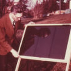 Gentleman stands alongside a solar heated water purifier. Notation expresses water boiled after four hours.