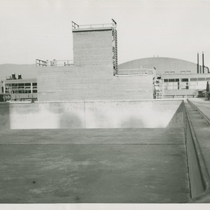 A view of the campus pool as it appeared before the Marine base was given to the University of California. The pool was used by the Marines to practice water landings and emergency parachute procedures; the jumping platform in the center of the photograph was converted to diving boards for the University. The old gym (Red Barn, Building 479) is in the background. After being converted to a co-educational facility, the gym was used for recreational activities for many years. The building is currently being used as overflow office space, and the original basketball court floor can still be seen in some of the rooms.