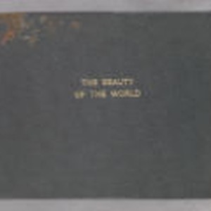Bound in textured black material. The title "The Beauty of the World" is embossed in gold lettering in the center of cover. The number "14" is affixed to the top of spine with glue. Contents are primarily clippings and print memorabilia collected by Charmian London after Jack London's death. Light wear over most of surface and edges. Top left corner of cover has some discoloration and tears in surface material, possibly from water damage. Some prints have been partially torn around the edges or off page.