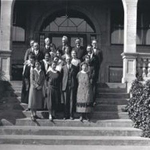Photo--black and white: Analy Union High School 1925 yearbook faculty photo on the steps of Analy High School.