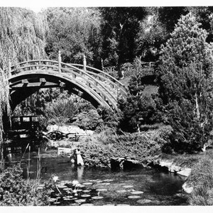 View of the ponds of the Japanese gardens, with the steeply sloping drum bridge on the left. On verso: View in Japanese Gardens, Oak Knoll, Calif.