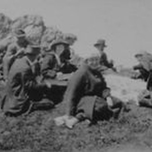 Photo, black and white: A group of people picnicking--possible the Hallbergs and / or Barlows.