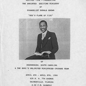 Revival Time, Williams Temple Church of God in Christ, Sunday School Department, 1988. A one page flier "presenting the Anoited Exciting Ministry of Evangelist Ronald Brown "God's Flame of Fire" with a picture of Evangelist Ronald Brown from Orangeburg, South Carolina & the Souls Unlimited Ministries Crusade Team, April 4th - April 8th, 1988, 628 N.W. 7th Avenue, Gainesville at 8:00pm nightly. Special Youth Fellowship Service on April 4th, Youth in Action 6:00 P.M. [Description English/roman)]