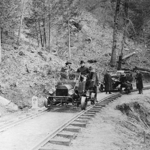 Two automobiles adapted to run on railroad tracks, traveling along a wooded hillside. Mr. Huntington sits in the first car with Mr. Rollins and Mr. Ward. MS note on verso reads "[Cascada, Calif. San Joaquin & Eastern R.R. 4/7/14.] Rollins, G.C. Ward, HE Huntington in 1st car." "Cascada" was the name for Big Creek from 1902 to 1926.