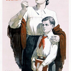 Soviet political poster. Caption and text read, "Проклятье поджигателям войны! Женщины всего мира, боритесь за мир! / Prokliat'e podzhigateliam voiny! Materi vsego mira, borites' za mir!", menaing, "Damn the warmongers! Women of the whole world, fight for the world peace!". [Description English/roman)]