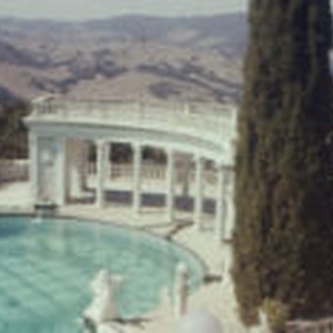 A Roman colonnade and marble statues surround the outdoor pool at the Hearst Castle.