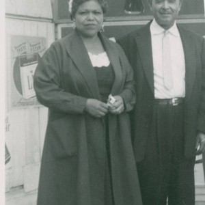 Lupe Aviles (nee Rivera) and Alberto Aviles stand in front of Coca-Cola and L&M cigarette signage during a trip to Mexico, circa 1946; Lupe wears a dress under a long coat, and Alberto wears slacks, a jacket and a tie.