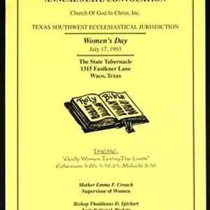 Annual state convocation, Women's day program, "Godly women testing the limits", Texas southwest, Church of God in Christ, State Tabernacle, Waco, Texas, 1993 July 17. [Description English/roman)]