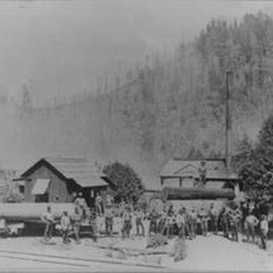 Photo--black and white: The workcrew at Riley Mill, Monte Rio, 1890. The crew stands in front of two rail cars loaded with redwood timbers.