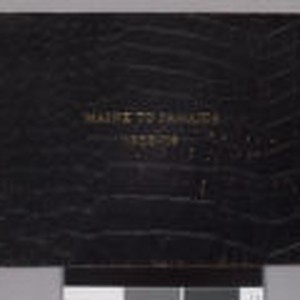 Bound in black faux alligator material. The title, "Maine to Jamaica 1906-06," is embossed on the center of the cover in gold lettering. The number "44" is affixed to the top of spine with glue. Photos are primarily travel shots of Maine and Jamaica during the Londons' honeymoon, including rural immigrant villages in the Blue Mountains. Also some postcards of scenery around Mt. Island, Maine. Moderate wear to surface and edges. Cover material on spine is loose and torn at the top.