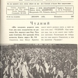 The Christian Herald was an informational organ of the Union of Pentecostal churches of "Assemblies of God" in South America. The journal was founded in August 1937 at the founding meeting of the Slavic Pentecostal churches of South America. Believers from Argentina, Paraguay, Uruguay and Brazil were present at the meeting. The purpose of the journal was to "carry unity and communication of the Spirit to the midst of believers in full Gospel". The journal united Pentecostal churches and became a link which connected believers scattered all over the world. Thus, letters of Christians of Evangelical faith from Germany, Belgium, France, the Netherlands, Canada, the United States, Uruguay, Paraguay, the Philippines, China, Australia and other countries were published in the journal journal. The first issue was published in Russia in October 1937. Subsequently, the journal spread to 40 countries where the Slavic diaspora lived. The headquarters of the journal was located in Buenos Aires. Juan Zub-Zolotarow was responsible for the journal. He was a permanent editor for 42 years. The journal was published for offerings of believers. Spiritually-edifying and theological articles of Donald Gee, Alfred Goets, R. Bratslavsky, N. Vodnevsky, D. Bespalov were published in the journal. On the last pages, as a rule, information from local churches and the mission and evangelical fields of North and South America, Canada, Africa, Australia, India, Europe and China was published. Thus the activity of such evangelists as Oral Roberts, Billy Graham, T. Giks, and William Brankham was reported in detail. [Description English/roman)] Христианский Вестник -- информационный орган Союза Пятидесятнических церквей «Собраний Божиих» Южной Америке. Журнал был основан в августе 1937 года на учредительном собрании славянских пятидесятнических церквей Южной Америки. На этом съезде присутствовали верующие с Аргентины, Парагвая, Уругвая и Бразилии. Цель журнала: «Нести единство и общение духа между верующими в полное Евангелие». Журнал объединил вокруг себя пятидесятнические церкви и стал как-бы связующим звеном между верующими, рассеянными по всему миру, публикуя письма христиан веры евангельской-славян из Германии, Бельгии, Франции, Голландии, Канады, Соединенных Штатов, Уругвая, Парагвая, Филиппин, Китая, Австралии и других стран. Первый номер журнала, издававшегося на русском языке, вышел в октябре 1937 года. Впоследствии журнал распространялся более чем в 40 странах, где проживала славянская диаспора. Штаб квартира журнала находилась в Буэнос-Айресе. Ответственным за журнал был назначен И.Зуб-Золоторев, который и был бессменным редактором на протяжении 42-х лет. Издавался журнал на добровольные пожертвования верующих. В журнале печатались духовно-назидательные и богословские статьи Дональда Джи, Альфреда Гоетца, Р.Брацлавского, Н.Водневского, Д.Беспалова. На последних страницах, как правило, публиковались информационные сообщения от поместных церквей и евангелизационных и миссионерских полей Северной и Южной Америки, Канады, Африки, Австралии, Индии, Европы и Китая. Так освещалась подробно деятельность евангелистов: Орала Робертса, Билли Грэма, Т.Гикса, Уилльяма Бранхама. [Description (original non-English/roman language/script)]