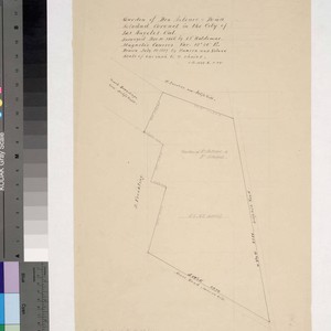 Original survey by Adolphus F. Waldemar on December 10, 1856 . Along Reyes and Wolfskill roads; acres, bearings, distances; pencil annotations. Adjacent property owners: J. Froehling, Mark Brundage, T. Sanchez now Wolfskill. Alt title supplied by cataloger.