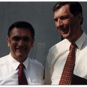 Fotografija Mihaela Kuzmiča s još jednim profesorom kako stoje ispred zgrade. [Description (original non-English/roman language/script)] Photograph of Mihael Kuzmič with one of the professors standing in front of a building. [Description English/roman)]