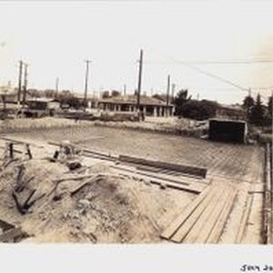 Photo, Sepia and white, Foundation construction of Sebastopol Post Office, July 20, 1935. Reinforcement bars are laid down where cement will be poured. "Robert McCarthy, General Contractor, San Francisco" sign is seen to the left on a small shed. Middle background is the depot building for the Petaluma & Santa Rosa Railway at 261 S. Main Street. To the extreme left top background is a Petaluma and Santa Rosa RR Co. sign.