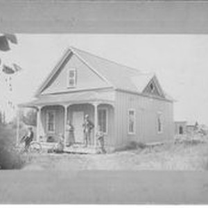 Photo -black and white, matted: The Frank A. Fleming home--probably in Bodega. Father--Frank A. Fleming; mother -Miranda Judith; daughter--Hattie A. Fleming. Other two men on the right and left are not identified but could be two other sons, Fred Seth and Frank M. Fleming. Circa 1900. Fleming was a farmer. Frank A. Fleming was the father of Frank M. Fleming--husband of Phebe Kingwell Fleming.