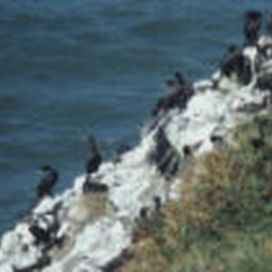 Two varieties of cormorants perched on waterside rocks.