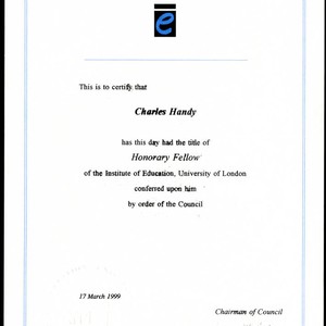 Certificate conferring Charles Handy as an honorary fellow of the Institute of Education at the University of London. This title was conferred upon Handy by the order of the Council. The document contains insignia from the Institute of Education.