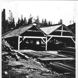 Photo--black and white: Streeten's Mill--Camp Meeker 1883. The end view of the saw mill is seen with board lumber in the foreground