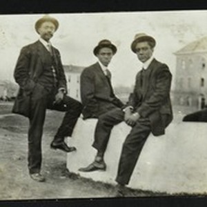 4 photographs in a photograph album, [s.d.]. 1. 4 unidentified men 2. 4 unidentified men and a crowd of people 3. an unidentified woman 4. an unidentified man. [Description English/roman)]
